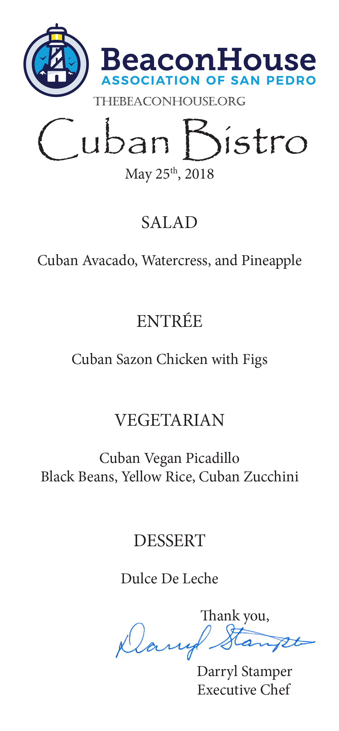 Our May Bistro will be featuring cuisine from Cuba. Come enjoy a night of fine food prepared by our culinary team at the Bartlett Center in San Pedro. “Meet the Men” and appetizers will begin at 5:30, check in is at 6:00 pm. Dinner is served at 6:30 pm. This is a good opportunity to learn more about The Beacon House and our mission.