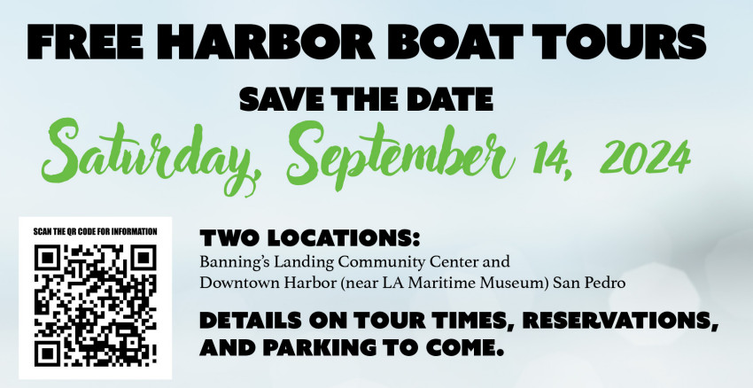 Save the date for a free boat tour of Los Angeles Harbor, courtesy of the Port of Los Angeles on Saturday, Sept. 14, from 10 a.m. to 3 p.m. Dog-friendly tours depart at 11 a.m., noon, and 2 p.m.