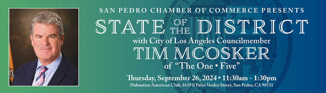 Experience one of the San Pedro Chamber’s largest networking events of year, the 2024 State of the District with Councilmember Tim McOsker on Thursday, September 26th from 11:30 am to 1:30 pm. The event will draw more than 300 attendees including business and community leaders from across the district. Please note: This is a two hour event.
