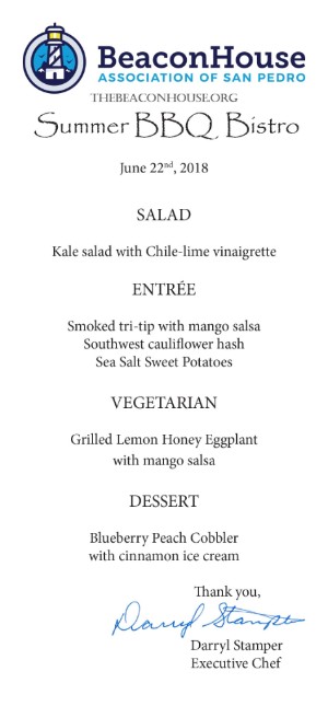 This month’s Bistro will be hosted at the Palos Verdes Art Center. The theme will be “Summer BBQ,” featuring smoked Tri-tip. Come early to meet the men of The Beacon House and enjoy some light refreshments and appetizers; meet and greet begins at 5:30 pm and dinner starts at approximately 6:30 pm. The Bistro is an opportunity for the community to meet the men of The Beacon House and hear their stories of hope from hopelessness, it is also a chance to find out more about the program, our impact in the community, our unparalleled success, and how the healing that occurs at The Beacon House can enrich your life as well. We invite you to get involved!