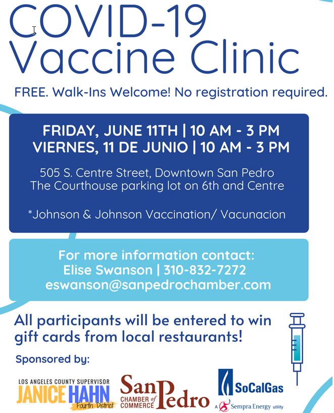 The San Pedro Chamber of Commerce is pleased to partner with Providence LCM, Supervisor Janice Hahn and SoCalGas to present a FREE Vaccine Clinic in downtown San Pedro on Friday, June 11th from 10:00 am to 3:00 pm. Please share the flier with employees, friends and family, and let’s get our community vaccinated!