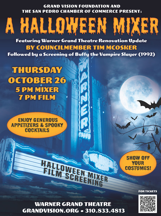 Meet and mix with San Pedro’s business and arts communities, Halloween film fans, and historic theater enthusiasts! Enjoy generous appetizers and drinks. All guests receive 1 drink ticket good for a soda, beer, wine or spooky cocktail.