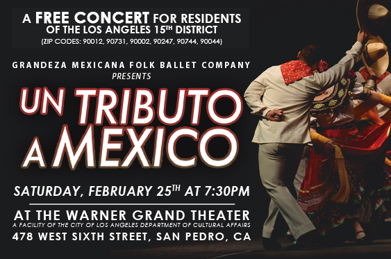 Grandeza Mexicana Folk Ballet Company today announces Un Tributo A Mexico, presented at Warner Grand Theatre in the city of San Pedro, for one night only. For the first time, the 50 member, U.S.A. premier Mexican folk ballet company brings their production: Un Tributo A Mexico, to San Pedro, California. Grandeza Mexicana Folk Ballet Company brings its high caliber representation of tradition and history with Un Tributo A Mexico in an evening that brings to life the rich and distinct culture of Mexico’s diverse regions.