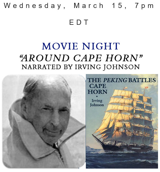 The film, shot in 1929 is silent, but narrated by Captain Irving Johnson in 1980, who was aboard “Peking” during this voyage and took all of the film footage with a camera he had brought with him. He was only 24 at the time. Johnson continued a career as a sailor, and met his wife, Electa “Exy” Johnson while working aboard a schooner bound for France. They married in 1932 and went on to circumnavigate the globe together, teaching young sailors, and writing several books, articles, and producing several films based on their adventures.