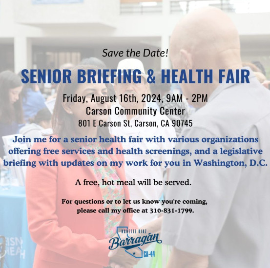 Join Congresswoman Nanette Barragan for her Free Senior Briefing and Health Fair. Congresswoman Barragan will update you on her work fighting for seniors and protecting Social Security and Medicare. A free hot lunch will be served at 12pm.