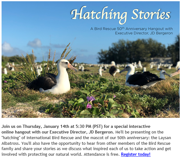 Join us on Thursday, January 14th at 5:30 PM (PST) for a special interactive online hangout with our Executive Director, JD Bergeron. He’ll be presenting on the “hatching” of International Bird Rescue and the mascot of our 50th anniversary: the Laysan Albatross. You’ll also have the opportunity to hear from other members of the Bird Rescue family and share your stories as we discuss what inspired each of us to take action and get involved with protecting our natural world. Attendance is free. Register today!
