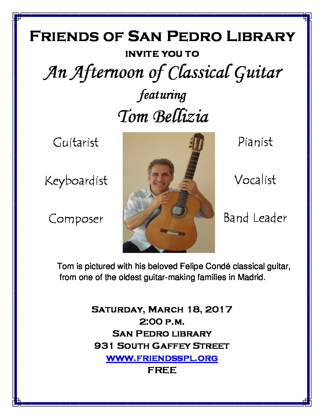 Join us for an afternoon with the very talented Tom Bellizia. Tom is a composer, pianist, guitarist, and vocalist. We welcome Tom to this Friends event to share his beautiful classical guitar music.